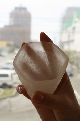 砕いたガラスを石膏の型に入れて窯で冷やし固めてつくられる器は、
