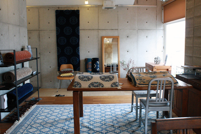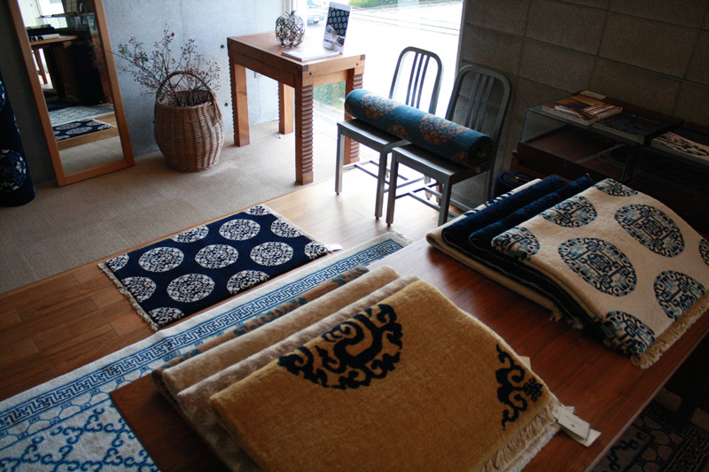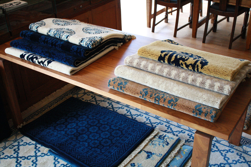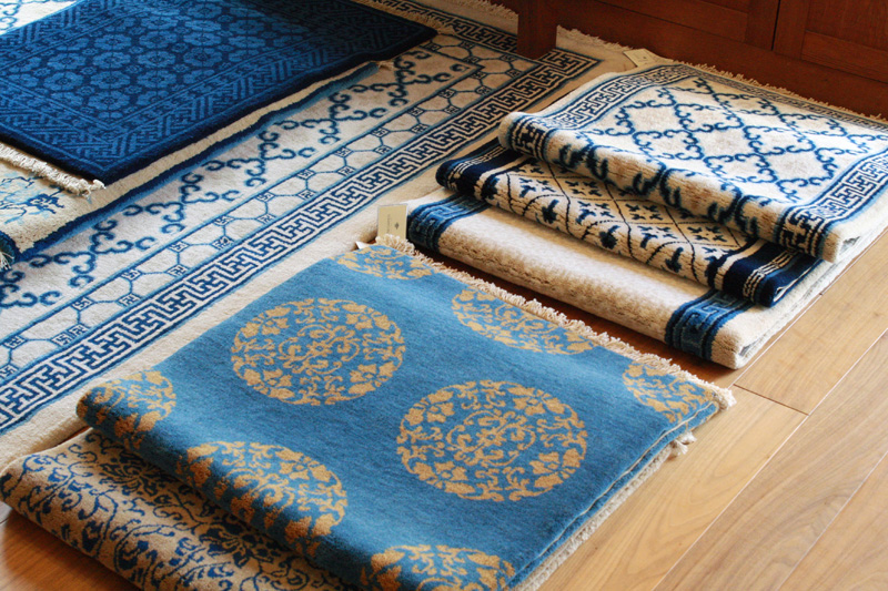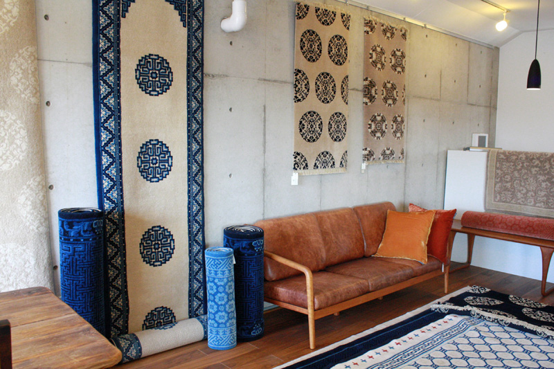 MUNIカーペットの特長でもある「藍」、実物を見るとやはり奥深い色合いに感銘、
