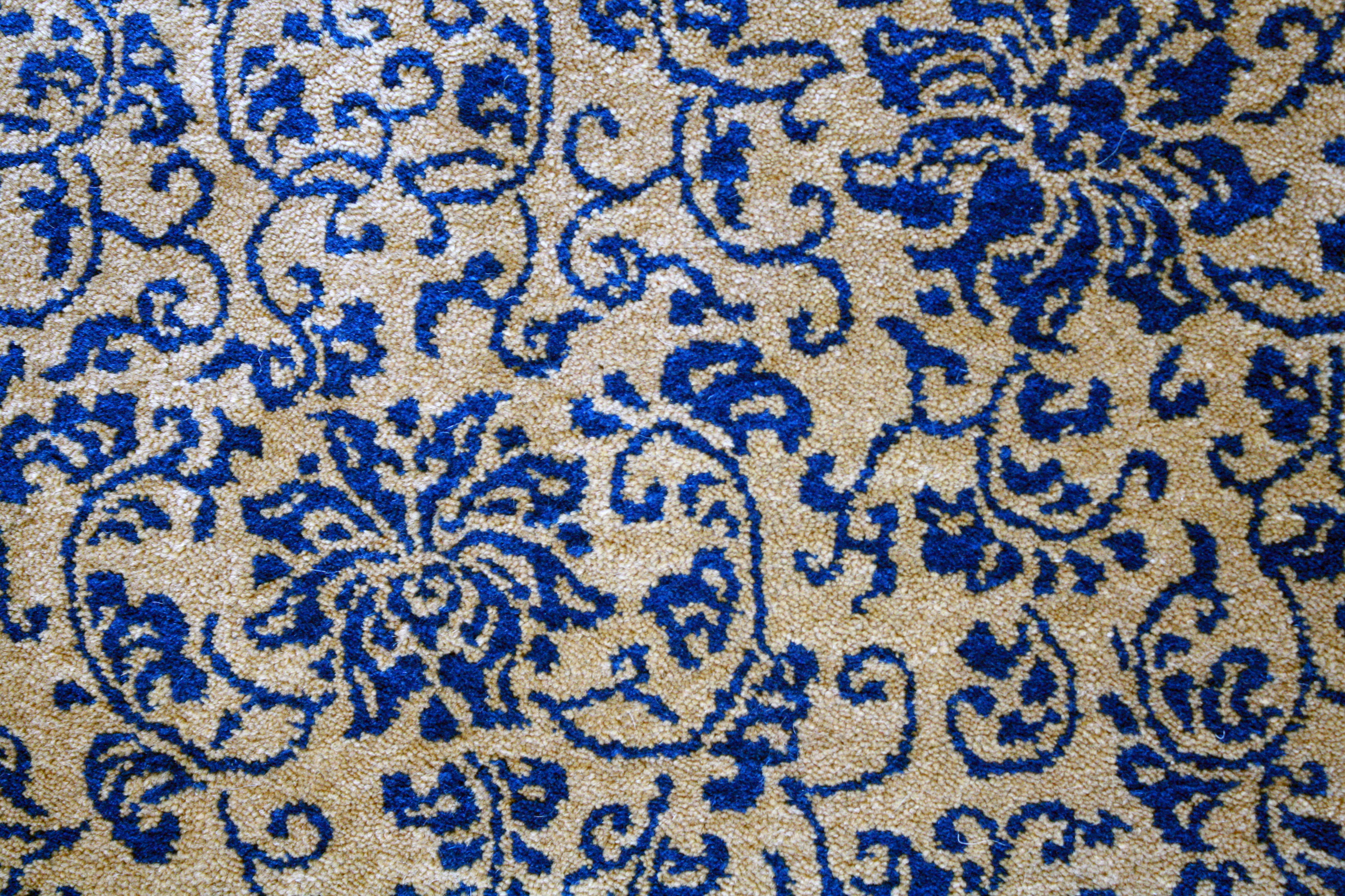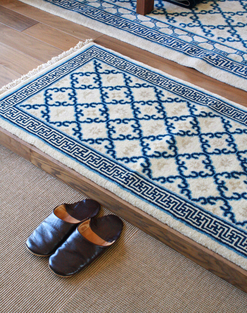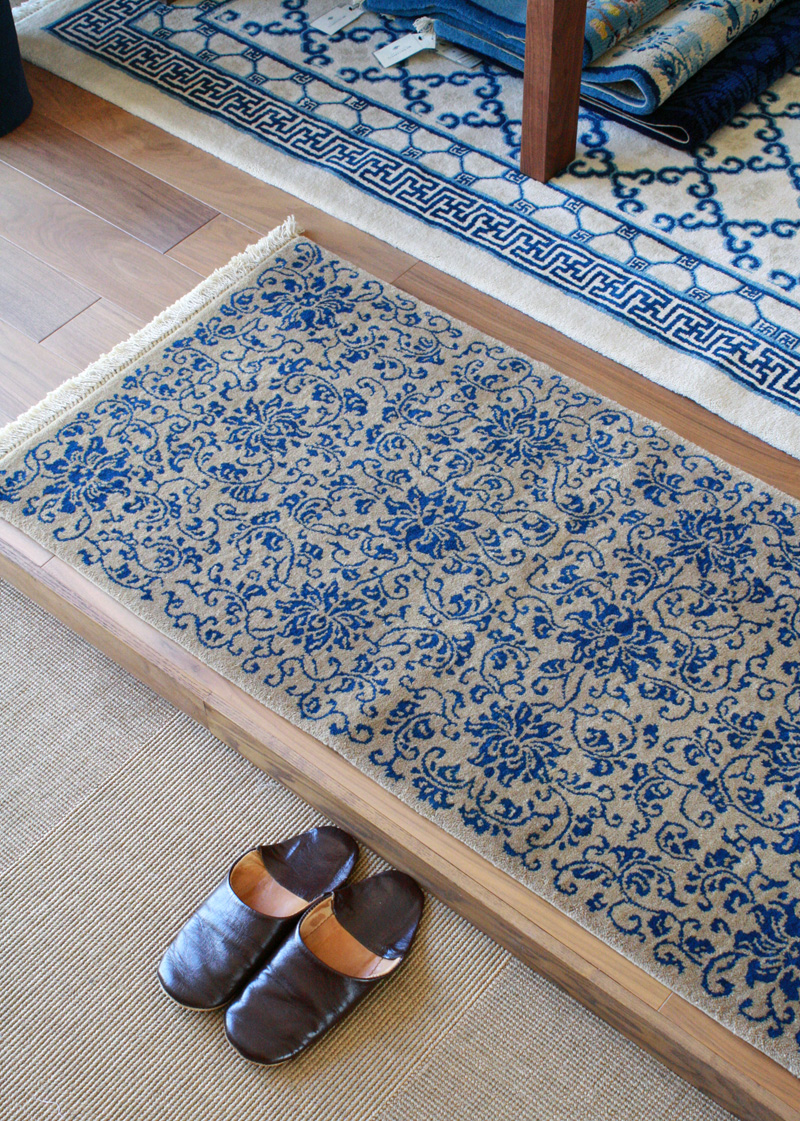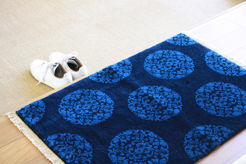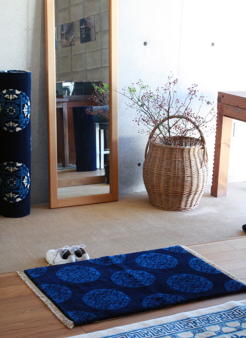 繁栄を意味する蓮文、藍の濃淡の組合わせ、インディゴブルーのラグはとても素敵です。