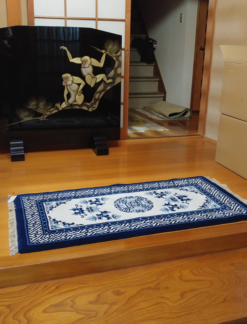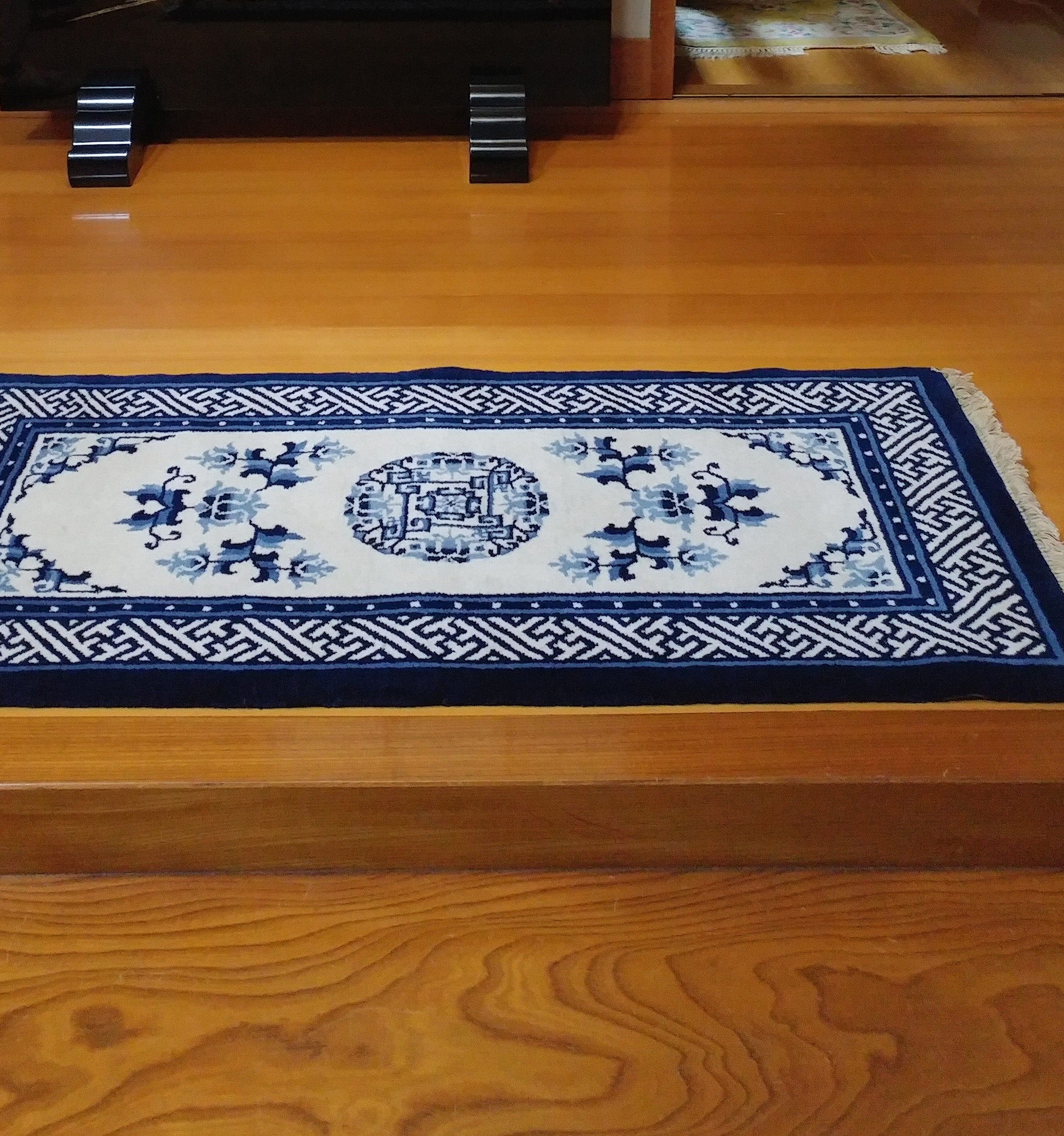写真の絨毯と、藍色全面の二種類の色合いの違う絨毯をお持ちし、