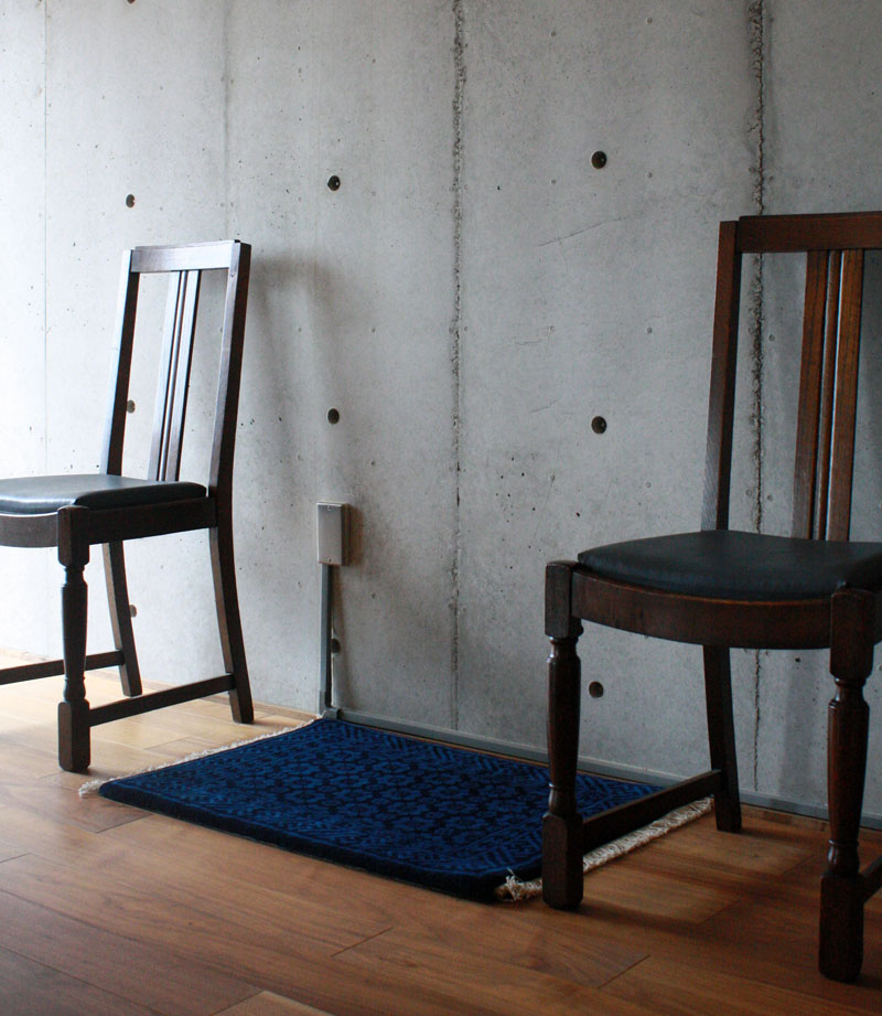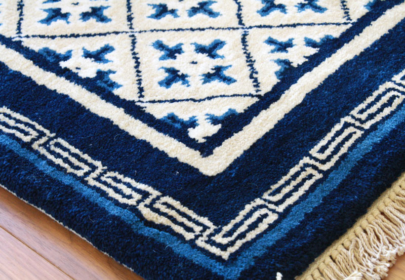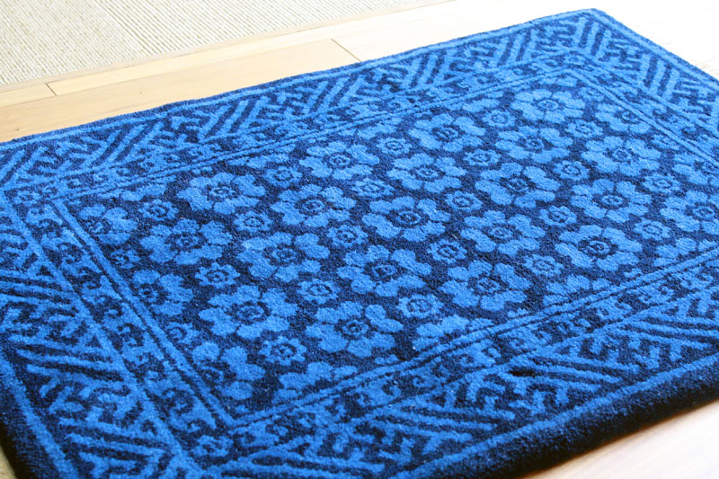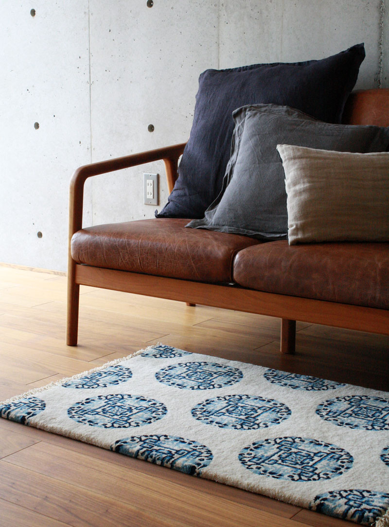 繁栄を意味する蓮文、藍の濃淡の組合わせ、インディゴブルーのラグはとても素敵です。
