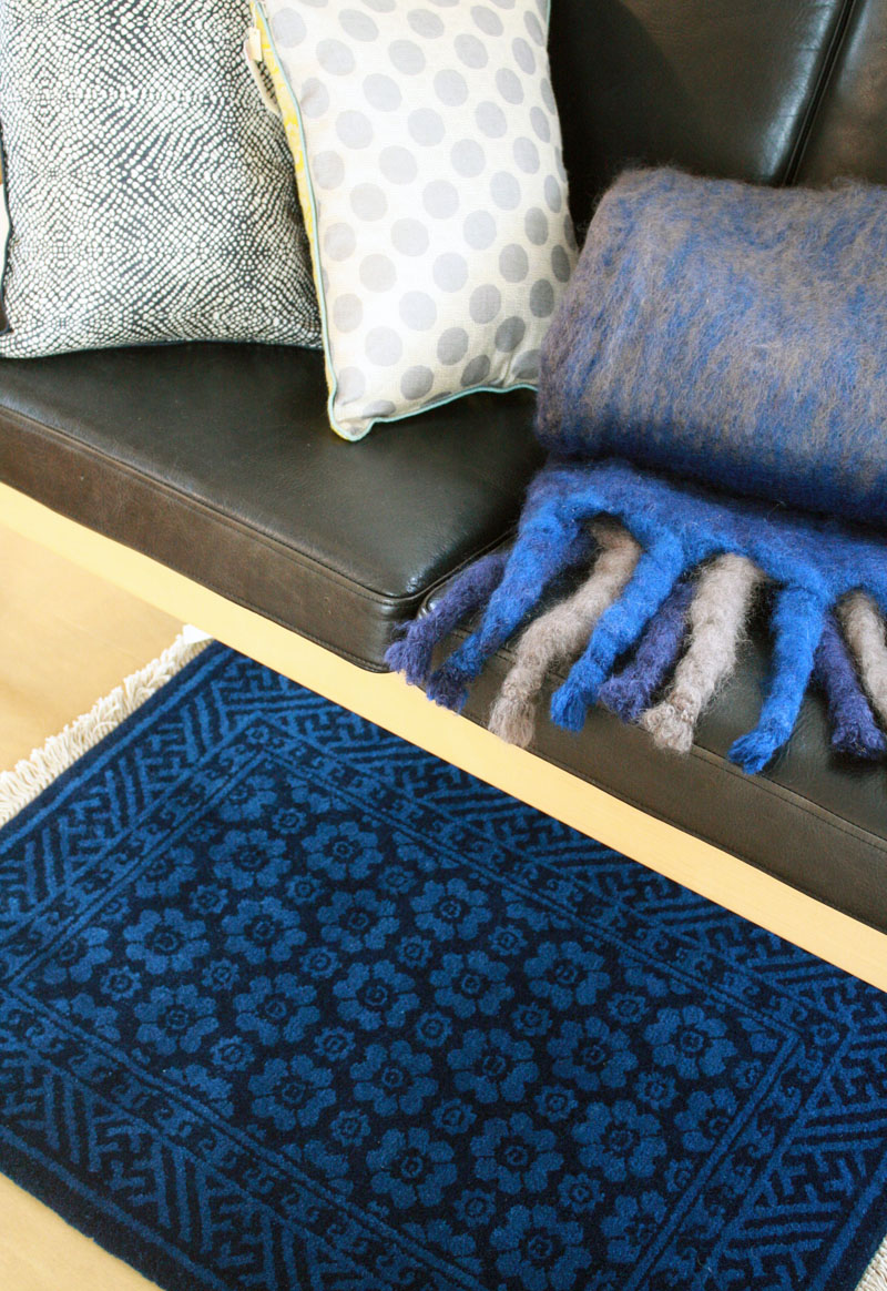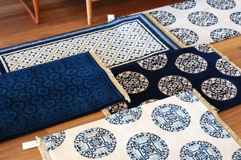 MUNIカーペットの特長でもある「藍」、実物を見るとやはり奥深い色合いに感銘、